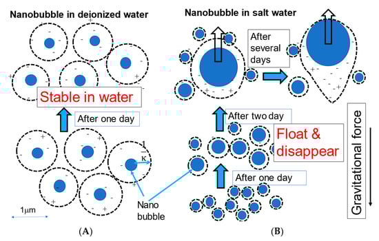 Figure 13 shows the schematic diagrams of nanobubble stability in deionized water (Figure 13A) and the nanobubble size change in a salt aqueous solution (Figure 13B). The nanobubbles in deionized water stably exist for two months by the Brownian motion. On the other hand, in the nanobubbles in a 1 mM salt aqueous solution, the nanobubbles coalesced with each other and increased the size, and the large-size bubbles gradually floated and disappeared after one or two weeks.