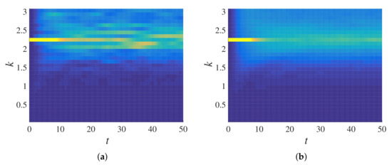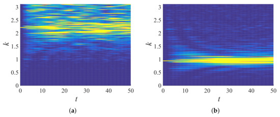 The master equation is an efficient tool in analyzing the stochastic crisscross transfer of energy between different wavenumber bands. In contrast to traditional, deterministic methods of order reduction [52,58,59,60,61,62], we did not focus on a subset of (lower) eigenmodes of the system, but grouped modes by wavenumbers (frequencies) to stochastically model the evolution in time, using only the much reduced set of wavenumber bands. Note that the master equation for frequency vs. space was already discussed in [4]. The transfer of spatio-spectral energy at time t is formulated as the evolution increment per time interval: