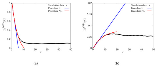 Furthermore, one can apply Taylor expansion on the nonlinear fitting expressions to obtain a linear procedure: Considering the first term, avoiding higher orders, we can rewrite the expressions as: , with the (negative) decay rate, at , and , with . Hence, the energy decay of a particular wavenumber (band) as the energy spreads to other bands can be fit by for small time intervals (well before reaching the saturation regime); similarly, is determined by fitting . Later, the linear and nonlinear fit are called the Linear (L) and Nonlinear (NL) procedures, respectively (Note that the origin of time is not exactly at zero, due to swing-in on the time scale of . Fit quality is improved by allowing the additional parameter , with and typically evaluating the nonlinear slopes at time or , not at ).