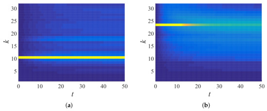 The initial condition for inserting a single energy into a single wavenumber bin k is . For such systems, without disorder, , the energy in the wavenumber space is invariant in time.