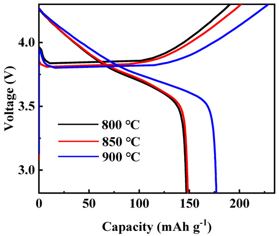 At first, the calcination temperature for the synthesis of Li[Ni0.6Co0.2Mn0.2]1−xGaxO2 (x = 0, 0.01, 0.02, 0.03 and 0.05) materials was optimized. Figure 1 shows the XRD patterns of the Li[Ni0.6Co0.2Mn0.2]0.98Ga0.02O2 sample prepared at different calcination temperatures. It is clear that all peaks can be indexed to the layer α-NaFeO2 structure with space group R3-m, and no impurity phase appeared. Low cation disorder for all samples can be confirmed by the lattice parameter ratio of c/a > 4.9 and the ratio of I(003)/I(104) > 1.2. With the increase in calcination temperature, the splitting degree of double peaks (006)/(102) and (108)/(110) rose, and the ratio of c/a gradually increased from 4.9485 for the sample prepared at 800 °C to 4.9548 for the sample prepared at 900 °C, indicating an improved cation ordering. This was further confirmed by the following charge–discharge tests, as shown in Figure 2. Among the three samples, the sample calcinated at 900 °C shows the smallest polarization and the highest discharge capacity. Its discharge capacity at a rate of 0.5 C reached 177.0 mAh g−1. In the following work, samples calcined at 900 °C are used to discuss the influence of Ga doping on the structure and electrochemical performance of Li[Ni0.6Co0.2Mn0.2]1−xGaxO2 (x = 0, 0.01, 0.02, 0.03 and 0.05) materials.