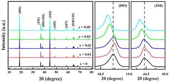 The structures and microscopic morphologies of Li[Ni0.6Co0.2Mn0.2]1−xGaxO2 materials were analyzed using an X-ray diffractometer (Rigaku, D/Max-2600-PC, Tokyo, Japan) and field emission scanning electron microscopy (FEI, Quanta-400F, Hillsboro, OR, USA), respectively. X-ray photoelectron spectroscopy (XPS) and energy dispersive X-ray (EDX) spectroscopy analysis for the sample with x = 0.02 were carried out in situ using an X-ray photoelectron spectrometer (PHI, 5000 Versaprobe II, Kanagawa, Japan) and a field emission transmission electron microscope (FEI, Tecnai G2 F30, Hillsboro, OR, USA), respectively. The electrochemical properties of the as-prepared materials were tested by galvanostatic charge–discharge test using CR2032 coin cells, in which the cathode electrodes, comprised of 80% active material, 10% Super P, and 10% poly(vinylidene fluoride) (PVdF), were pasted on porous Al foil; a Li metal chip was used as anode; 1 mol L−1 LiPF6/EC + DEC + DMC (volume ratio 1:1:1) was used as the electrolyte; and Celgard 2400 membrane (Charlotte, NC, USA) was used as the separator. The coin cells were assembled in a glove box (Etelux Lab2000, Etelux Inert Gas System (Beijing) Co., Ltd., Beijing, China) filled with argon and then installed on a land battery system (LANHE CT2001A, Wuhan Jinnuo Electronics Co., Ltd., Wuhan, China) to test the charge–discharge performance in the voltage range of 2.8–4.3 V. Electrochemical workstation (IM6eX, Zahner Elektrik GmbH & Co. KG, Kronach, Germany) was used to test the electrochemical impedance spectroscopy of the fully discharged cathode electrodes (2.8 V vs. Li/Li+), in which the frequency range was 100 mHz–100 KHz, and the AC amplitude was 5 mV. The thermal stability of Li[Ni0.6Co0.2Mn0.2]1−xGaxO2 materials (typical weight 6.2 mg) in the charged state (4.3 V, vs. Li/Li+) was analyzed with a differential scanning calorimeter (Q2000, TA Instruments, New Castle, DE, USA) under the following test conditions: nitrogen atmosphere; heating rate, 5 °C·min−1; and temperature range, 50–350 °C.
