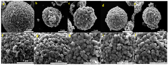 FESEM images of the prepared Li[Ni0.6Co0.2Mn0.2]1−xGaxO2 (x = 0, 0.01, 0.02, 0.03 and 0.05) materials are shown in Figure 4. It can be seen that all five samples present the morphology of dense agglomerated secondary spherical particles with a particle size of ~10 µm. It is noted that the primary particle size increased from ~300 nm for x = 0 µm to ~1 µm for x = 0.02–0.05; the crystal planes and grain boundaries became clearer, indicating that a moderate Ga doping is beneficial for promoting crystal growth.