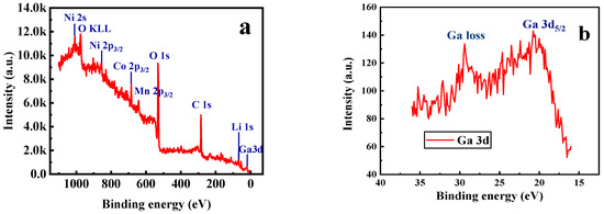 XPS spectra of Li[Ni0.6Co0.2Mn0.2]0.98Ga0.02O2. (a) Survey scan; (b) Ga 3d spectra.