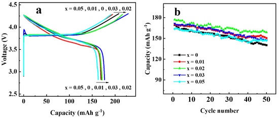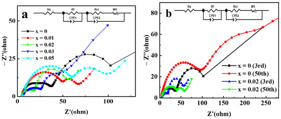 Electrochemical impedance spectroscopy (EIS) analysis was used to further clarify the mechanism for the improvement of the electrochemical performance of NCM622 by Ga doping. The Nyquist plots of Li[Ni0.6Co0.2Mn0.2]1−xGaxO2 electrodes are displayed in Figure 9. The Nyquist plots consist of the following: (a) a semicircle in the high frequency range assigned to surface film resistance; (b) another semicircle in the medium frequency range assigned to charge transfer impedance; and (c) a sloped line in the low-frequency range assigned to the impedance of diffusion of lithium ions [40]. The analysis of the plots was performed by fitting the equivalent circuit; the fitting results for Li[Ni0.6Co0.2Mn0.2]1−xGaxO2 electrodes after three cycles are shown in Table 1. Compared with pristine electrodes, the Ga-doped cathode electrodes with x = 0.01, 0.02 and 0.03 exhibited minor decreased surface film resistance (Rf), and remarkably reduced charge transfer resistance (Rct). This indicates that Ga doping can improve the electrochemical activity in the interface of electrode/electrolyte, thereby helping to reduce electrochemical polarization and enhance the capacity and rate performance. However, the Rf value for the sample with Ga content x = 0.05 increased significantly, which may be due to the presence of impurity phases on the surface of the material. Although impurity phases are not observed in Figure 1, the research based on synchrotron XRD analysis confirmed the limited solubility of Ga in the LiNiO2 and the formation of impurity phase Li5GaO4 for the Ga-doped LiNiO2 samples [34]. The Li+ diffusion coefficient can also be calculated by using the method in reference [28] to process the EIS data. The obtained Li+ diffusion coefficients for the samples with Ga content x = 0, 0.01, 0.02, 0.03, and 0.05 are 1.30 × 10−12, 5.80 × 10−11, 8.85 × 10−11, 6.92 × 10−11, and 3.81 × 10−11 cm2 s−1, respectively. The change trend of the Li+ diffusion coefficient is completely consistent with that of the charge transfer impedance, which may be related to the synergy of charge transfer. Compared with the pristine sample, the Ga-doped sample with x = 0.02 exhibited a Li+ diffusion coefficient as high as about 53 times, which is consistent with its best electrochemical performance. EIS analysis of Li[Ni0.6Co0.2Mn0.2]0.98Ga0.02O2 was further conducted after 50 cycles, and the results, compared with those of a pristine electrode, are presented in Figure 9b. The Rf and Rct of the pristine electrode increased from 18.62 and 32.34 Ω in the 3rd cycle to 96.26 and 135.6 Ω in the 50th cycle, respectively, resulting in an increase in the interface impedance by 180.9 Ω. However, the Rf of the Ga-doped sample with x = 0.02 increased by 19.31 Ω, and the Rct decreased by 17.82 Ω due to the improved electrode activation, resulting in an increase in the total interface impedance by only 1.5 Ω after 50 cycles. It can be concluded that Ga doping can effectively suppress the increase in interface impedance of the Ga-doped cathode electrode during cycling, which is beneficial for enhancing capacity retention.