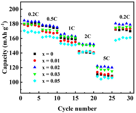 To investigate the effect of Ga doping on the electrochemical performance of Li[Ni0.6Co0.2Mn0.2]1−xGaxO2 materials, the as-prepared materials were assembled into 2032 coin cells for the charging and discharging tests. Figure 7 shows the initial charge–discharge curves (Figure 7a) and the cycling performances (Figure 7b) at 0.5 C (1 C = 200 mA g−1) in the voltage between 2.8 and 4.3 V. The discharge capacity of the samples with Ga content x = 0, 0.01, 0.02, 0.03, and 0.05 were found to be 169.3, 170.1, 177.0, 171.3, and 163.2 mAh g−1 in the first cycle, and 140.2, 150.4, 158.9, 147.3 and 146.9 mAh g−1 after 50 cycles, with the capacity retention of 82.8, 88.4, 89.8, 86.0, and 89.7%, respectively. Enhanced discharge capacity for the sample with x = 0.02 may be attributed to the improved cation order. However, when the Ga content was x ≥0.03, the discharge capacity dropped again, which may be due to the excessive doping of Ga3+ without electrochemical activity. In addition, the rate performance of Li[Ni0.6Co0.2Mn0.2]1−xGaxO2 was also investigated, as shown in Figure 8. Among the five samples, the one with x = 0.02 still showed the best electrochemical performance, with a discharge capacity that reached 183.4 mAh g−1 at 0.2 C and 121.1 mAh g−1 at 5 C, respectively. It was noted that the capacity from 26 cycles to 30 cycles at 0.2 C, followed by a charge–discharge at 5 C from 21 to 25 cycles, still retained 97.9% of its initial discharge capacity at 0.2 C in the first cycle. The above results reveal that a Ga substitution for 2% of the transition metal elements in the NCM622 material can significantly improve the electrochemical performance.