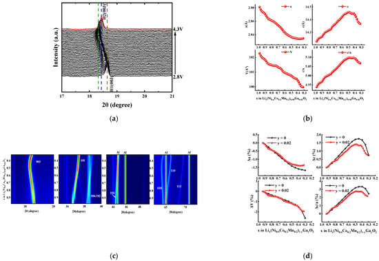 In situ XRD analysis for Li[Ni0.6Co0.2Mn0.2]0.98Ga0.02O2 electrode during charging process from 2.8 V to 4.3 V: (a) (003) diffraction peaks; (b) contour plots; (c) changes in lattice parameters; (d) relative change of lattice parameters (the data for sample with y = 0 from reference [5]).
