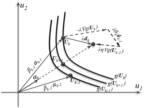 where denotes the finite-step length and dk represent the conjugate vector that can be computed using the following formulas: