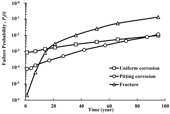 In case the value of the stress intensity factor () reaches the fracture toughness (KIC), which is associated with the critical crack value attained, fracturing will occur. The limit state function can be modeled as the difference between the fracture toughness and the stress intensity factor (Equation (14)), where a is replaced by P(t) using Equation (8), and the value of KIC can be obtained from experimental tests by first determining the Charpy V-notch values [47].