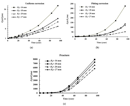 To address the influence of the nominal diameter, D0, of the steel bars on the failure probability (Pf) of the reinforced beam structure, four different diameters were used as the mean values: 16 mm, 18 mm, 20 mm, and 27 mm. The time-dependent reliability analysis results are shown in Figure 4a–c for the uniform, pitting, and fracture-based failure modes, respectively. It should be noted that these results are illustrated in terms of the ratio of the time-dependent failure probability with corrosion (i.e., uniform, pitting or fracture) to the failure probability at the beginning of corrosion initiation (t = 1). Therefore, the higher this ratio, the higher the impact caused by the mode of failure. As expected, an increase in the nominal diameter of the bars resulted in a reduction in the failure probability (i.e., ). In addition, after 50 years of service life, the influence of the diameter is amplified. Another observation is that the values of the ratio / for the case of pitting corrosion are much higher than for uniform corrosion, while the probability of failure due to fracture, caused by pitting corrosion, is found to be the highest.