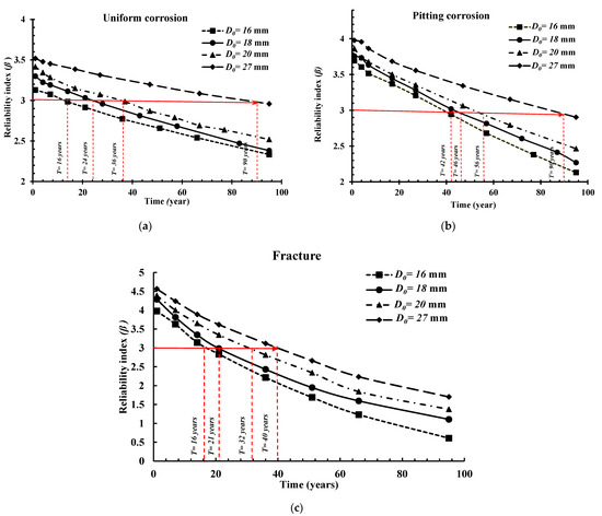 Influence of the nominal diameter of the bar (D0) on the reliability analysis results for the (a) uniform corrosion form, (b) pitting corrosion form, and (c) fracture failure mode.