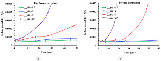 Influence of the corrosion rate at the beginning of propagation (icorr(1)) on the reliability results. (a) Uniform corrosion form, (b) pitting corrosion form.