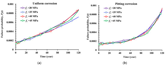 Influence of the concrete compressive resistance (fc) on the reliability results. (a) Uniform corrosion form, (b) pitting corrosion form.