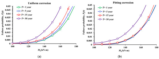 The final investigated effect was the external moment applied onto the RC beam subjected to uniform or pitting corrosion. Figure 8 illustrates the failure probabilities versus the applied moment within a range of 100 and 180 KN-m for different stages of service life for the beam at 1, 5, 15, and 50 years. As expected, the higher the applied load, the higher the failure probability for both corrosion forms, and for all the stages of the structure life. In addition, the corroded reinforced beam is more vulnerable when the service life reaches 50 years. It can also be observed that the influence of general corrosion, in accordance with the external moment, is uniform, where the older the structure, the higher the failure probability. However, for pitting corrosion, the results show that the effect was similar in accordance with age, which can be explained by the high risk to fail due to the concentrated penetration (pit) of the corrosion (unlike the general (uniform) corrosion on the bar’s surface).