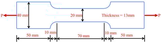 The shape and size of uniaxial tensile specimen are presented in Figure 1. It has a variable cross section with a total length of 190 mm. The cross section of both the top and bottom part of the specimen is 40 mm × 13 mm with a length of 50 mm. The cross section of the middle measuring part is 20 mm × 13 mm with a length of 70 mm, and the variable cross-sectional segment has a length of 10 mm, which is curve-designed with a curvature radius of 14.41 mm. In this way, the cross-sectional area of the measuring part is smaller than that of the variable cross-sectional part, avoiding the breaking of the expected gauge length [].