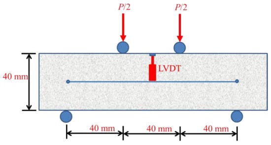 For uniaxial tensile performance, self-designed dog-bone thin plate specimens were adopted. The size and loading mode of samples are shown in Figure 1. A uniaxial tensile test was carried out using MTS hydraulic servo testing machine (MTS Industrial Systems (China) Co., Ltd., Shenzhen, China), and the loading rate was 0.1 mm/min. The gauge length was 50 mm in the middle of the dog-bone specimen, and the test was terminated when the strain was no less than 2%. In the test, the MTS testing machine’s load and displacement sensors were used to collect the full uniaxial tensile stress-strain curves of the specimens for analysis. A total of four uniaxial tensile specimens were tested for each mixture at each temperature. As shown in Figure 2, prism specimens with a size of 40 mm × 40 mm × 160 mm were used to do the four-point bending test after high temperature treatment. Displacement control was adopted with loading rate of 0.05 mm/min. We used load sensors (Zhongcheng Sensor Co., Ltd., Bengbu, China) to collect load change and a Linear Variable Differential Transformer (LVDT) displacement sensor to acquire the beam span deflection change. A total of four bending specimens were tested for each mixture at each temperature.