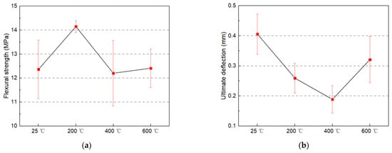 Bending performance: (a) Flexural strength; and (b) Ultimate deflection of heated multi-scale fiber reinforced cement matrix composite (MSFRC).