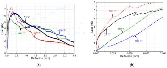 Effect of temperature on the load-deflection curve of heated MSFRC at (a) 0–3.5 mm and (b) 0–0.1 mm.