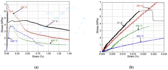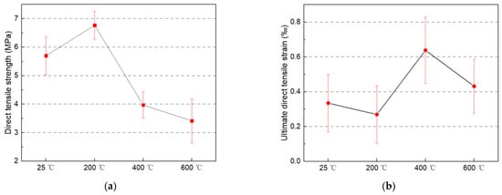 Figure 6a shows the uniaxial tensile stress-strain curve of MSFRC after high temperature treatment. The stress-strain curves without high temperature treatment at normal temperatures show excellent deformation and load-holding capacities. As shown in Figure 6b, the strain corresponding to the ultimate stress is still relatively small. Also, the load-holding capacity and energy dissipation capacity (the envelope area under the curve) is good. Specifically, at 0.5% and 1.5% strains, the specimen’s stress can remain at more than 75% and 50% of its ultimate stress, respectively. At 200 °C, the specimen’s peak tensile stress is significantly increased, which is mainly due to the internal curing and high temperature drying in the specimen, which improves the strength of the matrix. However, due to the thermal hardening of PVA fibers, the specimens’ deformability and load-holding capacity are reduced []. At strain levels of 0.25%, 0.5%, and 1.5%, the specimen’s stress drops to about 70%, 43%, and 25% of its ultimate stress, respectively.