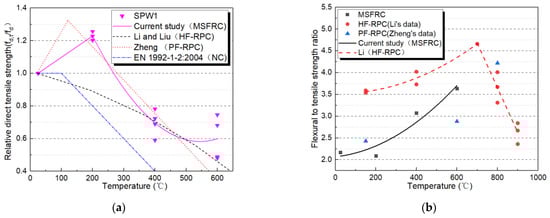Computation model of uniaxial tensile strength of heated MSFRC (a) Relative uniaxial tensile strength versus temperature; (b) Flexural to uniaxial tensile strength ratio versus temperature.