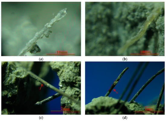 After crushing MSFRC specimens under applied loading, the fragments were collected for observation by an optical microscope. Large amounts of cement paste, and even large chunks of mortar, were attached to the PVA fiber surface at room temperature, as shown in Figure 9a. This indicates that the PVA fiber is bonded closely to the matrix and has a good cooperative working performance. The reason is that the abundant hydroxyl groups on the PVA fiber surface lead to its strong hydrophilicity, thus enhancing the bonding force between the PVA fiber and the matrix. However, after 200 °C, the colorless and transparent PVA fibers became light yellow, as shown in Figure 9b. The reason is that in an alkaline environment, PVA fibers undergo an oxidation reaction and elimination reaction after high temperature treatment, resulting in changes in the chemical composition of PVA fibers []. Double bond C=O was generated when exposed to heat, resulting in higher rigidity of the main molecular chain. Therefore, the tensile strength of PVA fiber was increased, and PVA fiber’s elongation decreased at 200 °C []. As a result, the strength of MSFRC increased after high temperature treatment at 200 °C, while the deformation capacity decreased. The results of flexural properties and uniaxial tensile properties in Section 4.1 and Section 4.2 confirmed the above analysis. The change of uniaxial tensile properties was more evident than that of bending tensile properties.