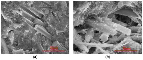 The micron scale CW is challenging to identify under the optical microscope in Figure 9. Under SEM in Figure 10, CW dispersion in the matrix is shown. In Figure 10a, the pore channels left after CW pullout and tensile fracture can be seen at room temperature, verifying the effectiveness of CW in crack inhibition enhancement at the microscopic level. At 600 °C, CW’s overall morphology and structure generally remain intact, and there is no significant deterioration compared with that at room temperature [,]. Figure 10b shows the morphology of a defect filled and bridged by CW. Figure 10b also indicates that hydration products on the CW surface at 600 °C are significantly more common than those at room temperature. This shows that new hydration products are generated on CW’s surface, which confirms that the synergistic effect of “internal curing” of hot steam and CW ultimately resulted in improved mechanical properties of MSFRC at high temperatures.
