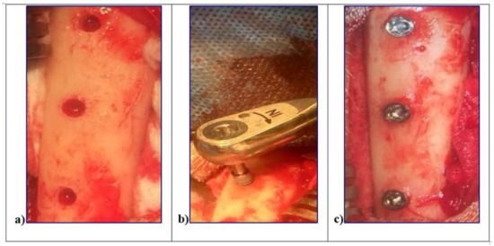 In vivo surgical procedures of the L1, L2, and sandblasted and acid etched (SBAE) implants insertion in sheep tibiae. (a) Surgical sites preparation. (b) Implant fixture insertion at 8.5 mm depth from the outer contour of the tibia. (c) Simultaneously, implants insertion to the top of the cortical bony crest.