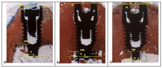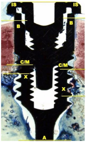 At 100× magnification, landmarks scheme adopted for the histological measurements: Shoulder of the implant (IS), the most coronal bone-to-implant contact point (B), the intersection between cortical and marrow bone compartments (C/M), the most apical bone-to-implant contact point (X), and the apex of the implant (A).