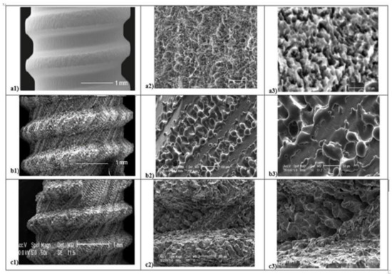 Scanning Electron Microscope (SEM) analysis of titanium surfaces at 50×, 400×, and 800×: SBAE (a1–a2–a3), L1 (b1–b2–b3), and L2 (c1–c2–c3) (black marked scale bars reported are equal for each set of magnifications).