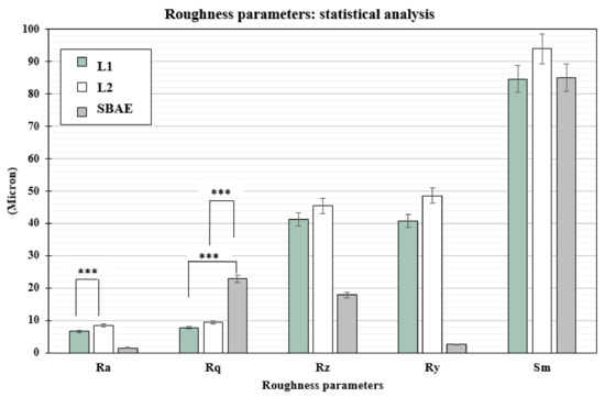 t-test statistically significance relationship between the profilometric data recorded: p-values ≤ 0.005 was considered positive. Ra of L1 vs. L2 (0.0013), and Rq of L1 vs. SBAE (0.0001) and L1 vs. SBAE (0.0001), showed surface textures statistically significant differences (*** p ≤ 0.005).