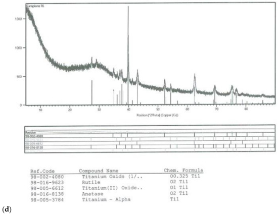 On all the titanium surfaces analyzed, Energy Dispersive X-ray (EDS) and X-ray Power Diffraction (XRD) analyses showed the presence of biocompatible elements (Oxygen, Titanium, Aluminum, and Vanadium and compounds) (Figure 5a–d).