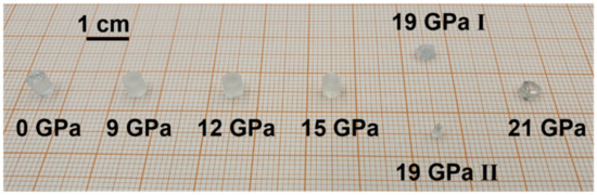 With Equation (1), where mAir, mH2O and mheavy liquid are the mass of a reference weight in the corresponding media and ρH2O is the density of water at corresponding temperature, the density of the liquid and subsequently, in the case of flotation, the density of the sample can be determined. Sodium polytungstate (SPT) was dissolved in distilled water to obtain a heavy liquid with an initial density of ~2.9 g/cm3. The density of the heavy liquid can be easily adjusted by either adding distilled water to lower the density or adding stock initial heavy liquid to increase its density. This procedure was repeated until flotation of the sample was accomplished and observed for 20 min to assure an equilibrium of the density liquid. In addition, we monitored possible temperature changes with an accuracy of 0.5 °C and a stainless steel cube, functioning as the reference weight, was kept inside the liquid at all time to minimize the influence of a temperature gradient. Two samples, e.g., the 21 GPa and the 19 GPa I cylinder, were observed in the liquid at the same time to ensure certainty of separation inside the liquid and to consequently detect density variations between each other. Compared to the conventional Archimedes method, the sink–float technique does not longer rely on the mass of the sample, but on the mass of the reference weight. This guarantees a very high precision density determination, as the uncertainty of the balance (mReference >> mSample) affects the measurement less. We estimated the accuracy of the sink–float technique was three times higher in comparison to the conventional Archimedes method, resulting in an uncertainty of ±0.002 g/cm3.