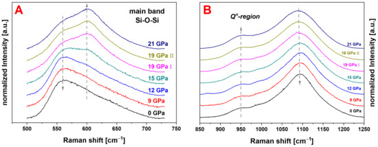 Raman spectra (400 cm−1–1300 cm−1) of the densified cylinders with increasing maximum pressure; visible variations of the main band from 500 cm−1–730 cm−1 are related to the evolution of the Si–O–Si inter-tetrahedra angle distribution [9,22]; the Qn-region (850 cm−1–1250 cm−1) is assigned to Si–O stretching vibrations [25].