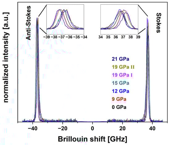 Brillouin spectra of the permanently densified cylinder series with Pmax of 0 GPa, 9 GPa, 12 GPa, 15 GPa, 19 GPa I, 19 GPa II and 21 GPa; the insets highlight the evolution of the peak positions.