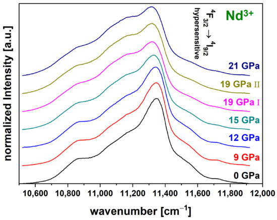 The luminescence spectra of the Nd3+ were collected in the range between 9320.5 cm−1 to 12,678.5 cm−1. The region between 10,520 cm−1 and 11,920 cm−1 was extracted from the raw spectra and further evaluated (Figure 5). An accurate frequency position was maintained by monitoring the frequency of the excitation laser and routinely recalibrating the spectrometer. The spectrum in this region corresponds to the hypersensitive transition 4F3/2 → 4I9/2, which makes it especially suitable since it reacts to atomic environmental influences, e.g., stress and densification [15,27]. A linear background was removed with the anchor points being fixed at the endpoints of the spectra and a normalization to the total area was applied before plotting. To evaluate the variations of the Nd3+-luminescence, the previously mentioned centroid was obtained in the same manner (Equation (2)). With increasing pressure, the shoulder to the left of the main peak broadens and subsequently shifts the centroid position to lower wavenumbers.