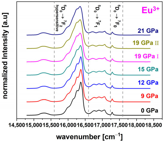 Exemplary luminescence spectra of the 5D0 → 7F0 (17,237 cm−1–17,597 cm−1), 5D0 → 7F1 (16,597 cm−1–17,237 cm−1) and hypersensitive 5D0 → 7F2 (15,597 cm−1–16,597 cm−1) transition of the Eu3+-luminescence for the permanently densified glass (0 GPa to 21 GPa); spectra were acquired with a 532 nm laser and the shown frequency bands were used as anchor points for evaluation.