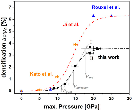 For better comparison with the literature (red dashed line, Ji et al.; blue datapoints, Rouxel et al.; orange datapoints, Kato et al.), the measured densification (black datapoints) over increasing maximum pressures is shown in Figure 7 [6,7,10]. It was calculated as the increase of density over the initial density Δρ/ρ0. The initial density of the pristine glass was determined at 2.505 g/cm3. The first sample densified with 9 GPa maximum pressure already showed an increase in density to 2.511 g/cm3 which is equivalent to 0.24% densification. The densification slightly increases for 12 GPa to 0.60%/2.520 g/cm3. Densification at 15 GPa maximum pressure had a drastic influence on the glass and caused a densification of 2.08%/2.557 g/cm3. As previously mentioned, the 19 GPa densification was repeated with a smaller cylinder (19 GPa II) as the cylinder of the consecutive series (19 GPa I) was damaged while preparation. Sample 19 GPa I shows the greatest densification with 3.67% and a density of 2.597 g/cm3, within the series, while sample 19 GPa II shows lower densification at 3.15%/2.584 g/cm3. Higher densification of glass can occur due to the presence of shear stress as it can lead to a better folding of the glass network [30,31]. The increased densification value of 19 GPa I is ascribed to shear stress since the sample happened to be directly in contact with MgO without the NaCl pressure medium in between. The differences within the 19 GPa samples gives insight on the reproducibility of the densification process. It is found to be satisfying, as the 19 GPa I sample is within the error bars of the 21 GPa sample (3.55%/2.594 g/cm3) and at the fitted saturation of densification of 3.55 ± 0.14%. As revealed by the concomitant floatation measurement, the sample at 21 GPa is undoubtfully denser than the 19 GPa II. The fitting of the experimental values (black dashed-dotted curve) was done using an enhanced sigmoidal function (Equation (5)) which is based on a function (Equation (4)) proposed by Ji etal. [6]. The fitting parameters are the maximum densification α, a variable fitting parameter β and P0.