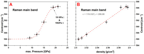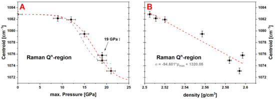 Figure 2 shows the overall measured Raman spectra of the experimental series from 400 cm−1 to 1300 cm−1, with the limits of the main band (500 cm−1–730 cm−1) marked by gray dashed lines. To better display the variations in the main band, Figure 3A highlights the isolated region. The main band consists of two contributions which vary over the experimental series: the contribution at ~560 cm−1 decreases while the contribution at ~600 cm−1 increases. Figure 8A shows the evolution of the centroid versus the maximum pressure and the density (Figure 8B). The centroid was determined at 586.0 cm−1 for the pristine glass and only a change within the error bars to 586.4 cm−1 can be observed for the 9 GPa sample. The 12 GPa sample shows the first significant variation to 587.5 cm−1, again suggesting that the limits of the elastic region falls between 9 GPa and 12 GPa. The 19 GPa and 21 GPa densified samples almost superimpose with a centroid value σ around 596.3 cm−1. These steady values state that the maximal closing of the Si–O–Si angle of the glass structure is reached. As the data seems to present a saturation at high pressure, it follows a similar sigmoidal behavior as previously observed for the densification. The centroid of the main band was fitted with Equation (5) (Figure 8A, red dashed line) and the obtained parameters are given in Table 1. The parameters m and Pinflection are within the error bars of those determined for the densification. In Figure 9 the evolution of the Qn-region centroid is shown and a shift of ~10 cm−1 towards lower wavenumbers is reported starting at the centroid position of 1082.8 cm−1 at 0 GPa. The increase of Pmax to 9 GPa/1082.2 cm−1 and 12 GPa/1081.9 cm−1 showed no significant change on the centroid position, where at 15 GPa the centroid was determined to be 1079.5 cm−1. At higher pressures the centroid was evaluated at 1075.8 cm−1 for 19 GPa I, 1074.9 cm−1 for 19 GPa II and 1073.1 cm−1 at 21 GPa and does not show a saturation plateau. It shifts in the opposite direction compared to the main band. As there is still a significant variation at very high pressure, it can be deduced that even though no further densification is achieved in this study, the glass structure and its building groups are still responding to an increase of Pmax (red dashed line). The sigmoidal fit of this Qn centroid gives m of 0.11 ± 0.01 and Pinflection at 17.2 ± 0.6 GPa (Figure 9A). For comparison, the gray dashed line represents a force-fit with Pinflection fixed at 14.5 GPa, which is the inflection point determined in the densification calibration. It is clear to see that the fit is not respecting the data at very high pressure and underestimates the saturation level. The calibration describing the dependency at the maximum pressure could be extended even further above 21 GPa when utilizing the Qn-region as observable. The Qn-region centroid shows an overall linear behavior in dependency to the measured density (Figure 9B), but with a higher dispersion compared to the main band behavior especially at higher densifications (Figure 8B).