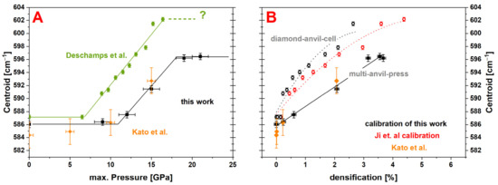 (A) Comparison of the Raman main band centroid evolution over the maximum pressure (black ≙ this work; green ≙ Deschamps et al.; orange ≙ Kato et al.); good overall agreement between the study of Kato et al. (MAP-densification) and the values determined in this work with the first structural variation starting at Ponset = 11.8 ± 0.3 GPa and a plateau after Pend = 18.0 ± 0.3 GPa at ~596 cm−1; values reported by Deschamps et al. show an earlier structural variation around 7 GPa and higher saturation value of ~602 cm−1; the discrepancy to Deschamps et al. could originate from the less hydrostatic conditions of the DAC used for compression. (B) Comparison of calibrations done with the Raman main band region (black ≙ this work; orange ≙ Kato et al.); filled symbols represent direct calibrations using MAP and are equivalent and linear; hollow symbols and guide for the eye (dotted curves) are generated by using the centroid data of Deschamps et al. (DAC) and the densification Pmax calibration of this work (black) respectively the calibration of Ji et al. (red).