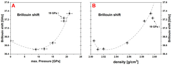 The Brillouin shift along the sample series presents an obvious non-linear evolution (Figure 11). It decreases unexpectedly from 36.71 GHz to 36.51 GHz with the first applied Pmax at 9 GPa and a densification of ~0.4%. After this minimum, it increases with maximal pressures up to 37.34 GHz at 21 GPa without showing any plateau. This last fact suggests that the long-range elastic properties are still affected by exceedingly applied pressure. Densified silica glass at ~4% densification also presents a minimum of its longitudinal sound velocity [8,33]. Local polyamorphism and the coexistence of low-density-amorphous and high-density-amorphous states were proposed to explain this phenomenon [34,35]. Anyhow, to our knowledge this was not reported for soda–lime–silicate glass, but the obtained experimental data implies that the structure of permanently densified soda–lime–silicate glass is presenting similar phenomena.