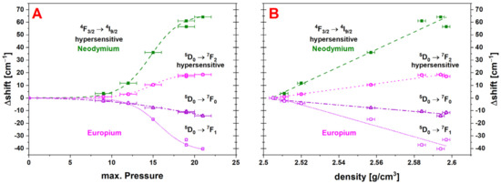 (A) Comparison of the different evaluated transitions of the luminescence of Nd3+ (4F3/2 → 4I9/2 ≙ green squares/dashed) and Eu3+ (pink hexagons/short dashed ≙ 5D0 → 7F2; lavender circles/dotted ≙ 5D0 → 7F1, purple triangles/dashed-dotted ≙ 5D0 → 7F0) versus applied Pmax. (B) Comparison of the different evaluated transitions of the luminescence of Nd3+ and Eu3+ with changing density; all transitions show a linear behavior and a rather large shift; the largest magnitude of shift is obtained for the hypersensitive transition of the Nd3+ with a fitted variation Δ = −66.31 ± 0.65%, REE-luminescence is considered as a high-potential intrinsic density sensor in glass.