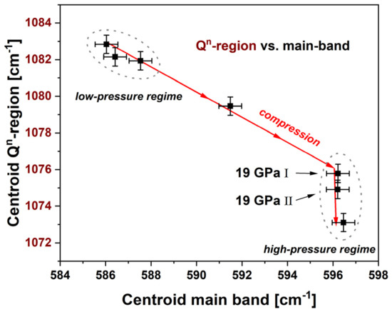 Comparison of the centroid of the Qn-region (left red axis) vs. the main band centroid (bottom black axis); a stronger variation of the main band in the elastic region can be observed; a linear evolution in the plastic deformation region up to 19 GPa is evident as a logical follow up as both observables behave in the same way in this region; above 19 GPa the Qn-region still shows variation while the main band remains the same; when utilizing Raman spectroscopy to analyze the pressure history it is preferable to use the main band calibration in the elastic region from moderate pressure up to its Ponset = 11.8 ± 0.3 GPa and the Qn-calibration at very high pressure as its Pend = 21.7 ± 1.0 GPa is located higher; in the plastic deformation region between Ponset < Pmax < Pend both calibrations are identical, but the main band shows a higher mf = 1.73 ± 0.13 cm−1 (Qn-region: mf = −1.29 ± 0.01 cm−1) and therefore is advantageous.