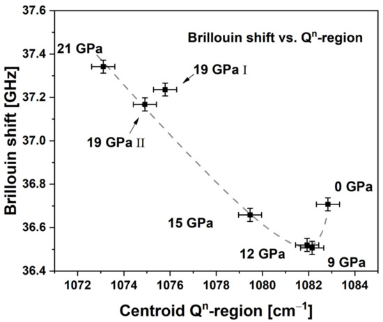 Comparison of the Brillouin shift with the centroid of the Raman Qn-region (gray dashed line is only a guide to the eye); using this cross spectral observation the samples densified >9 GPa are almost aligned and the non-hydrostatical sample at 19 GPa I in seen to be clearly out of trend.