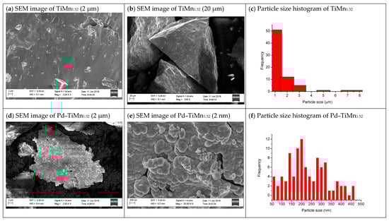 Figure 2 presents SEM images of TiMn1.52 before and after surface coating by autocatalytic palladium deposition. The uncoated alloy exhibited a relatively smooth surface, which was occupied by irregular-shaped particles varying in size from 1 to 8 µm. A particle size distribution histogram of the material indicated that the majority of the particles had a size of 1 µm. The alloy may be classified as a nonporous material. For the sample coated with Pd, a discontinuous layer of near-spherical Pd particles was observed. Moreover, the layer seemed to be very dense and uniform. A particle size distribution histogram (Figure 2f) estimated that this alloy had particles ranging in size from 50 to 475 nm, while the majority of the particles had a particle size of 200 nm.