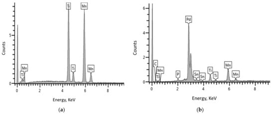 The EDS of Pd-coated alloy (Figure 3b) reveals that the impurities are phosphorus, carbon, and tin at a level of 0.70, 2.31, and 4.54 wt.%, respectively. The presence of these impurities may have resulted from palladium–tin (Pd–Sn) colloidal solution during sensitisation and activation of AB2 alloys as well as from the NaH2PO2-based plating bath during autocatalytic deposition of palladium. When comparing the EDS graphs (Figure 3a,b) of the two alloys, we observe that the net counts of Ti and Mn decreased from 10.25 and 9.7 to 0.9 and 1.5, respectively. This observation may be attributed to a successful palladium loading that covered most part of the alloy surface with a net count of 4.8, as witnessed in the EDS data.