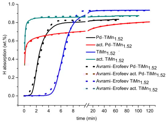 Fit of the experimental data for hydrogen absorption by nonactivated and activated materials using the Avrami–Erofeev equation.