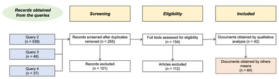 The resulting data extracted from the databases (i.e., Compendex, Inspec, GEOBASE, GeoRef and Knovel) for the period 1990–2021 for query 1 was 1176 records. However, after reviewing the records, it was found that most of them were not related to the main focus of this study. Therefore, queries 2 to 4 were more restrictive, leading to fewer and more relevant documents (Figure 1). For the research process, duplicate documents were removed, and titles and abstracts were screened for eligibility. Then, records were excluded if the document’s content was outside of the scope of the review (i.e., masonry, reinforced concrete or bridges, among others). Moreover, when the details of records did not provide enough information to determine whether the document was within or outside of the scope, a full review was conducted using the same criteria proposed by Breton et al. []. Finally, 42 articles were identified, and another 64 documents were obtained through other search strategies. The more than 100 documents selected were then reviewed to identify advances in wood buildings, particularly those focused on energy efficiency. The documents also provided background and support for other related documents to enrich the literature review.
