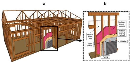 A wood frame combines structural and nonstructural elements. Its structural elements include wall studs, floor joists and roof trusses with floors, walls and roof sheathing. Nonstructural elements can be classified as insulation and finishing materials. Figure 2a shows a schematic drawing of the wood-frame structure, while Figure 2b shows a schematic drawing of how a wood-frame wall is built and insulated. In a wood-frame building, saw timber and wood products provide the framing system the ability to withstand vertical loads, such as snow, occupants and the building itself, as well as horizontal loads, such as earthquakes and strong winds []. However, it is important to emphasize that in regions where there is a risk of earthquakes and wind, it is advised to use reinforced walls, floors and roofs. Reinforcement is achieved by using a thicker sheathing board and spacing fasteners closer together [].