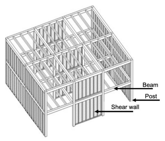 According to Li et al. [], a post-and-beam building is very similar to a wood-frame building; however, the post-and-beam structure is composed of two-dimensional assemblies: (i) horizontal components, such as floors, ceilings and roofs; and (ii) verticals components, such as walls (See Figure 3). Post-and-beam is a simple construction method in which the (traditionally rectilinear) beams support transverse purlins that are covered by a wooden deck, and the posts supporting the beams are usually arranged in a regular grid. Post-and-beam structures can be built with sawn lumber or with members made from pieces of lumber that are nailed together or to lumber, glulam, laminated veneer lumber (LVL), I-joints or poles. Plywood, OSB, lumber and CLT panels can be used for shear walls [].