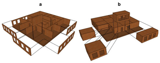 As mentioned in previous sections, the use of prefabricated wood elements is also a very interesting strategy for mass timber buildings. Since it is possible to build with higher quality and more precision by including products, such as CLT and glulam or other custom-made products, this could lead to process innovations, such as lean manufacturing [,]. Using prefabricated wood elements results in (1) a reduction in on-site installation time and the overall schedule, (2) a reduction in on-site deliveries, (3) a reduction in on-site waste and related disposal costs, (4) the ability to use other compatible products and simultaneously perform off-site work under controlled conditions, (5) a reduction in the number of change orders issued and requests for information or improvements, and (6) a reduction in the scheduling phase and on-site labor costs for follow-up trades []. Although this is an extremely important topic, as Kedir and Hall [] have pointed out, studies focusing on energy efficiency and new forms of construction for mass timber buildings are still limited. Industrialized components can be used in mass timber buildings as planar components (Figure 5a), i.e., walls, floors or ceiling slabs, and as volumetric components corresponding to room modules (Figure 5b), i.e., semi-independent units [].